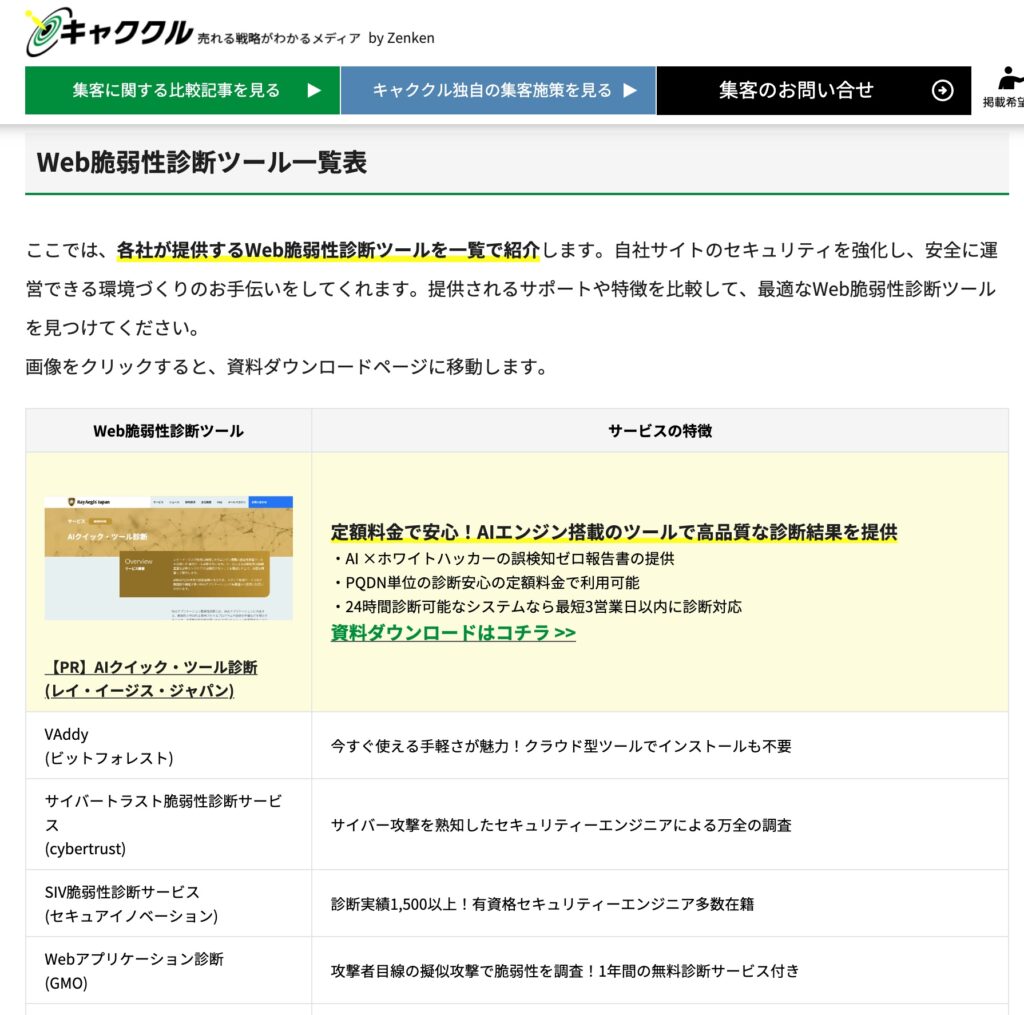 Zenken株式会社が運営するマーケティングメディア「キャククル」に、当社が提供する「脆弱性診断サービス」と「ペネトレーションテスト」のサービスが掲載されました。