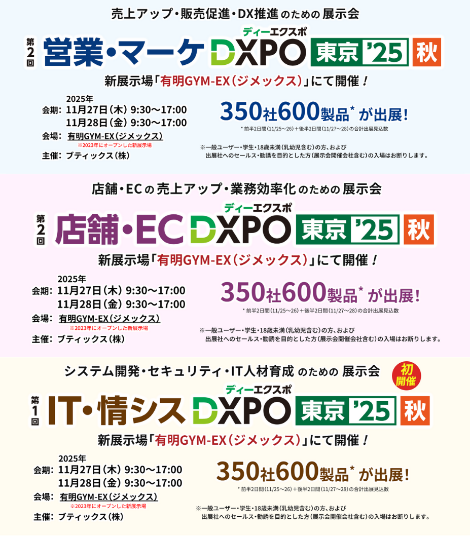 今回の展示会は、IT・情報システム部門や店舗・EC事業者向けに、システム開発、セキュリティ、DX推進のための最新ソリューションを一堂に集めた総合展示会です。